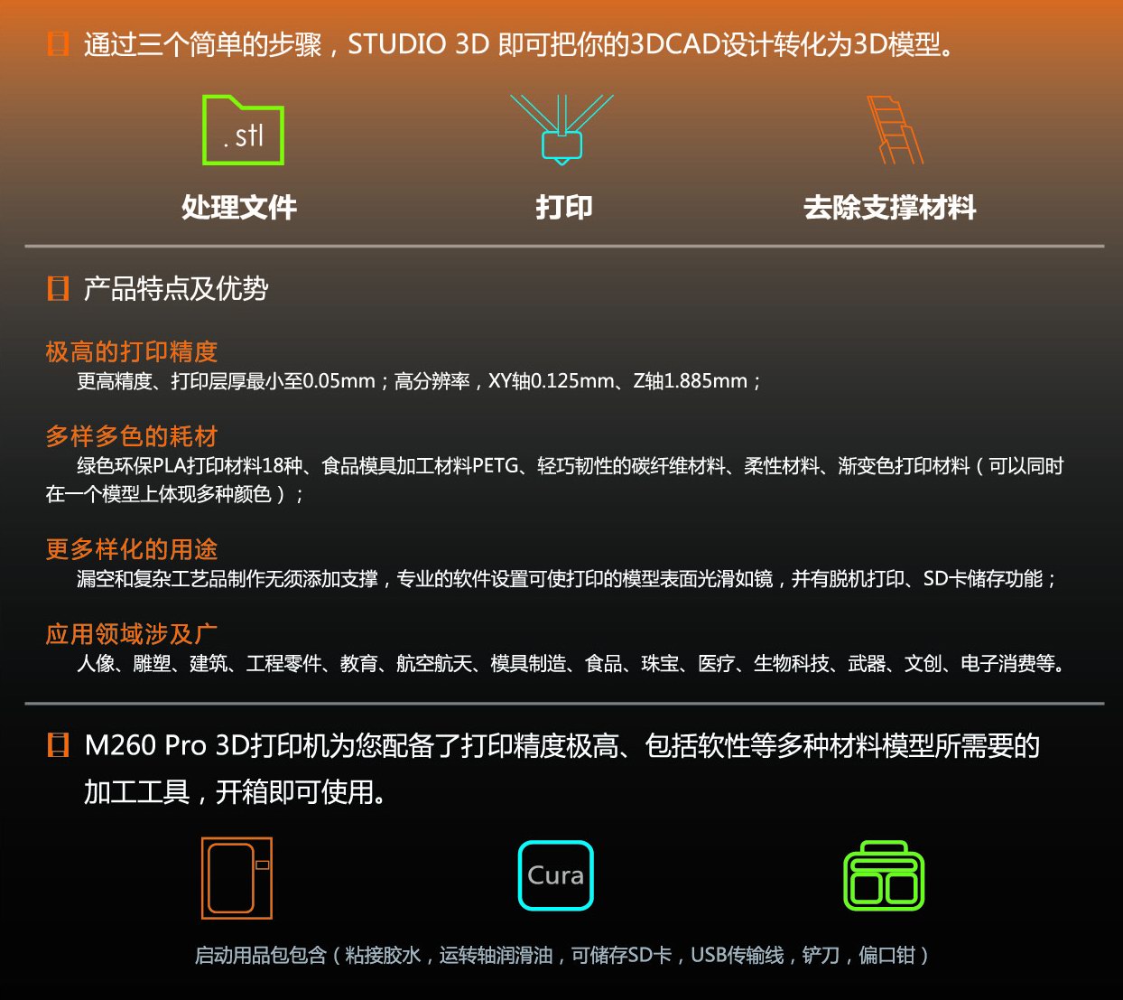 M260PRO系列3D打印机是为追求高品质,高性价比的中小型企业而设计。独有的核心构造使您在享受高质量打印任务的同时,对打印成本,打印效率和打印成功率等有更全面的把控。我们深知一台高效,稳定的3D打印机对您的意义。因此提供企业级的售后服务是我们对您的最大支持。